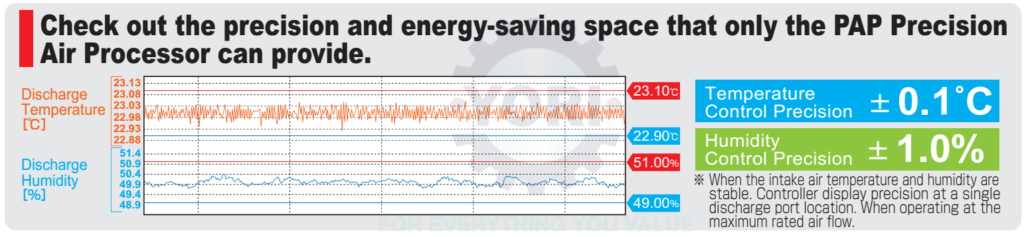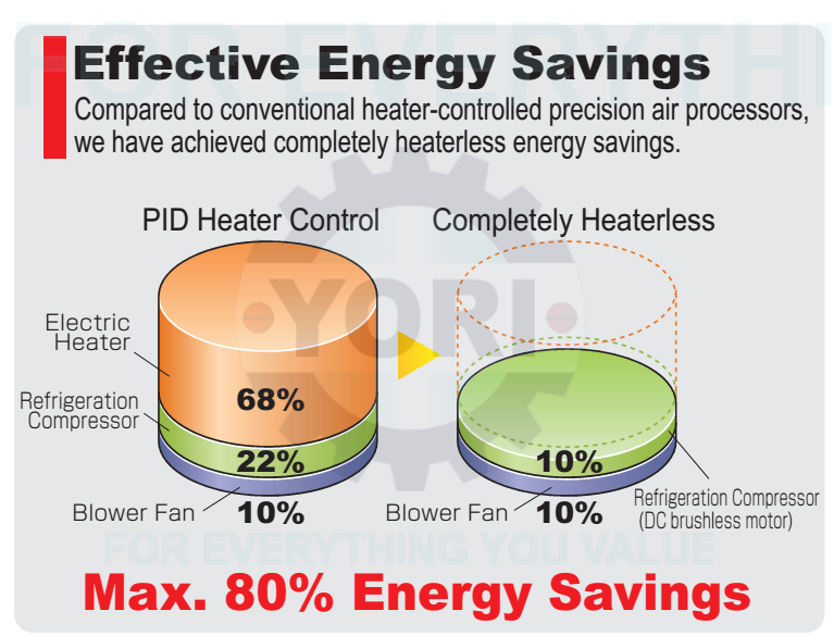 Nhờ vào công nghệ cân bằng bơm nhiệt (không sử dụng bộ gia nhiệt) và điều khiển biến tần. Mang lại hiệu quả tiết kiệm đến 80% so với điều hòa hính xác kiểu PID.